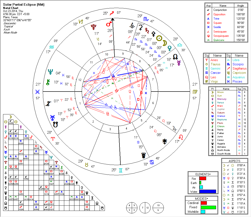 Astrologically speaking, October 2014 has been a busy month. And, this Solar Eclipse, producing a New Moon Stellium in Scorpio (in the eighth house in Plano, where the chart was cast), is no exception.