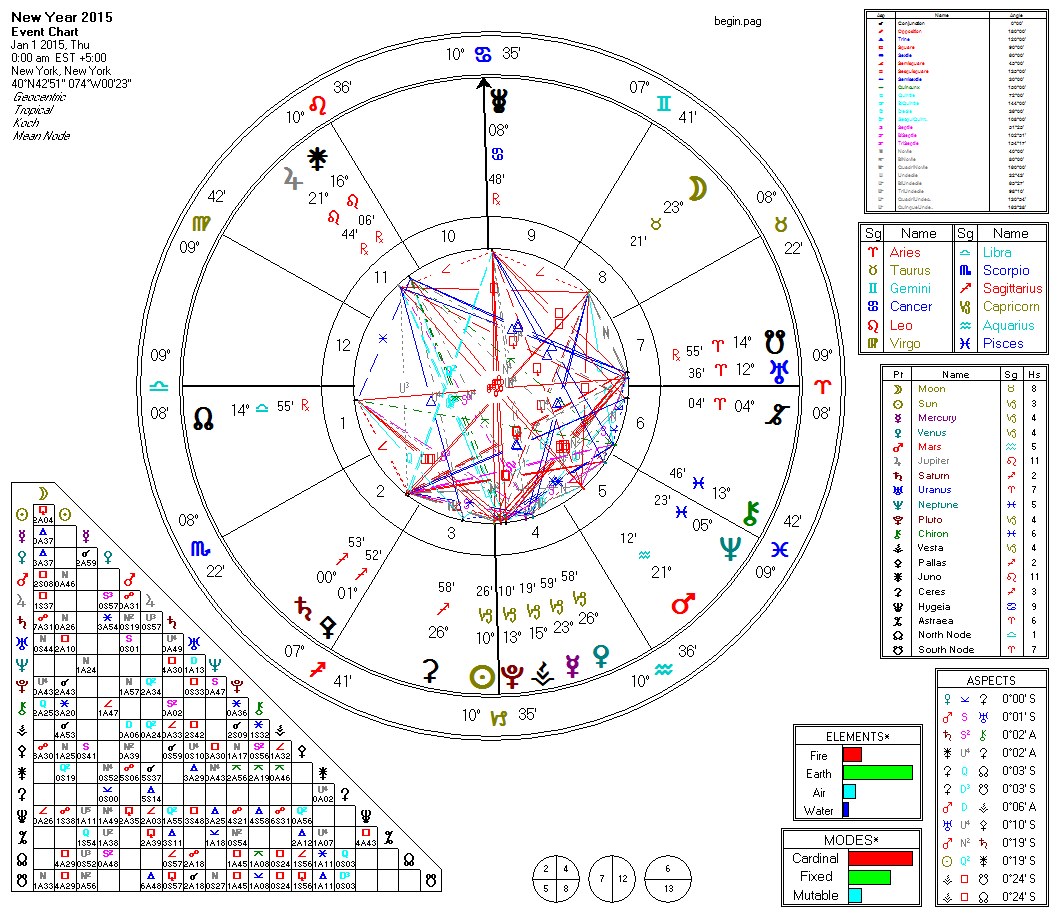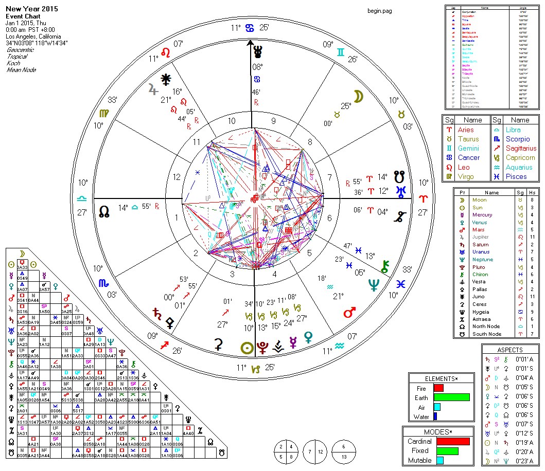 We note, first, that the astrological new year (as well as a number of other new years) occurs at the time of the Vernal Equinox, often called “the first day of Spring.” That said, here are charts for the turn of the calendar from 2014 to 2015. We start with Plano (local to the astrologer) and proceed through London, New York City, and Los Angeles.