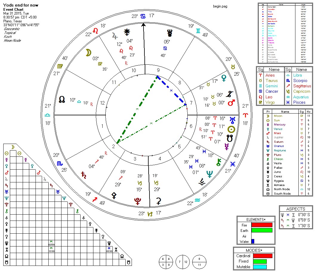 Many of these patterns flow into the early April patterns that precede the Lunar Eclipse in April. We will address those in a separate post. We begin with a powerful yod, accompanied by a lesser yod, that dominates the sky from March 22nd through March 31st. We present beginning and ending charts for this period and note that others may prefer to cast variants of these charts at other times and in other locales: