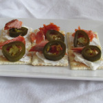 Spread crackers with cream cheese, top with a bit of smoked salmon and a jalapeno ring. Sit back and watch as it gets devoured in less time than it took to throw together. Thanks, Anthony!
