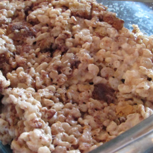 Lightly butter a 8×8 or 9×9 pan. In a medium pot over low heat, combine butter and marshmallows, stirring occasionally until marshmallows and butter are melted together. Once melted, remove pot from heat, stir in Rice Krispies and chopped cookies. Pour mixture into prepared pan and press into pan with a lightly buttered spatula.