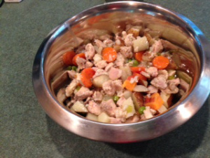 Thanks much to our Mom, Rita, for sharing the recipe that keeps her elderly dog going. The human food she makes is amazing – we can say for sure that he’s one lucky dog! Read on: