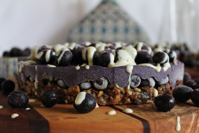 Holy walnuts, this is delicious. The filling is basically just an awesome blueberry-banana smoothie and the crust is walnuts and dates. You’re gonna love my nuts (or be disturbed by my grotesque and obscure sense of humour). In any case, you actually will love this recipe, which includes nuts. Owned by me. Making them my nuts. So you will love my nuts. HAH.