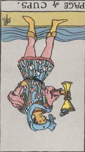 The Page of Cups Reversed represents emotional immaturity. Someone may be acting self-centered, needy or insecure. Someone may expect others to care for them, as if they were a helpless child. If this is you, know that there is a great power in learning to care for and please yourself. Someone could also be very protective of their emotions. They may be avoiding relationships and foregoing pleasure out of fear of being hurt. This card could also indicate discomfort with your own intuition. You may be ignoring or distrusting of your intuitive voice. If this is the case, seek guidance to help you connect with your inner wisdom. So, for today only, be gentle with yourself and be sure to set aside some time for daydreaming. It’s ok to say “no” to invitations or uncomfortable situations. Having good emotional boundaries is essential to restoring your energy on days like today.
