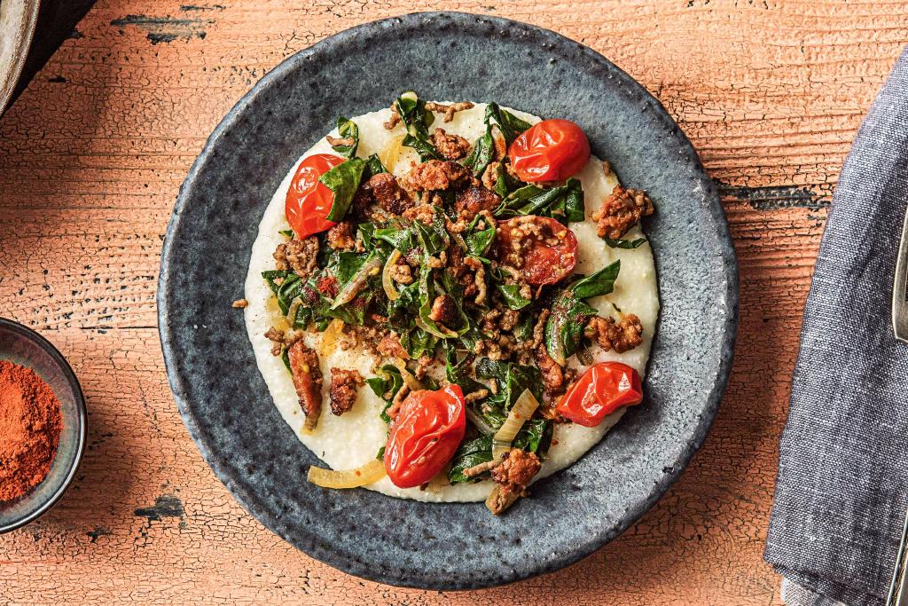 BLT. PBJ. EVOO. The food world has no shortage of acronyms, but we’d like to introduce a new one: CKT. This tasty trio combines the savory spiciness of chorizo, the vitamin-powered heartiness of kale, and the tanginess of tomato. And when you cook it up in a skillet and serve it over cheesy polenta, it becomes the pinnacle of home-cooked comfort. With your DIY skills FTW, it’s enough to make you exclaim OMG!
