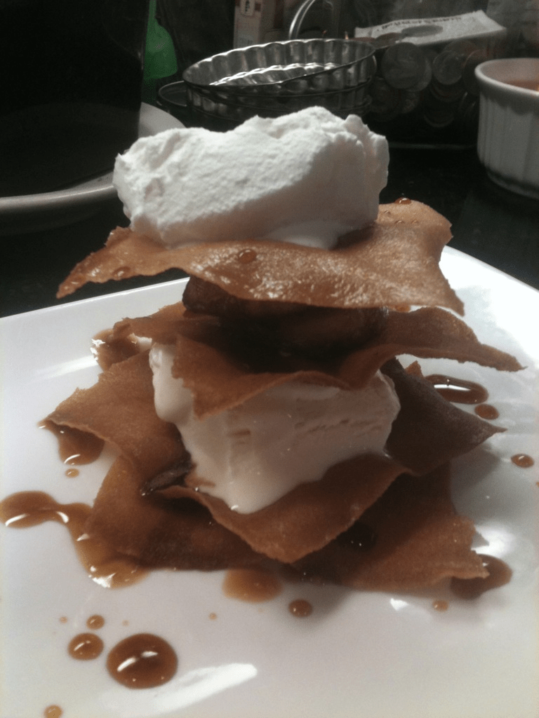 I came up with this recipe about a year ago when trying to come up with a menu for a friend’s 40th birthday. Okay, so the name isn’t very catchy but this dessert is positively addictive! Cake was settled on for the party but I’ve been making this ever since. The inspiration for this dessert came from two separate sources: 1) my friend Victoria’s mother’s awesome turon; and 2) a dessert from Slanted Door in San Francisco – tapioca pudding with a brown sugar ginger sauce. When I first dreamed it up, the dish came out like this.