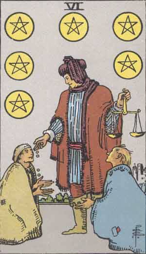 This card is about giving and receiving and the balance between them. It could be indicating that you show gratitude for what you have received by giving to charity or helping another with resources. Pay it back. It could be that if you have been giving of yourself you will see your effort returned. Don’t be too proud to accept help from those that have more. What goes around comes around. Pay attention to how you use your energy and resources. If you feel resentful or exhausted, look for ways to give in a more balanced manner. If you are not getting what you expect in a situation, look at what you are giving. Regarding relationships, pay attention to how you give and take with that person. Is your relationship fair, or is one person doing most of the taking and little of the giving? Even if we have very little in a material sense, there is always some way we can give.