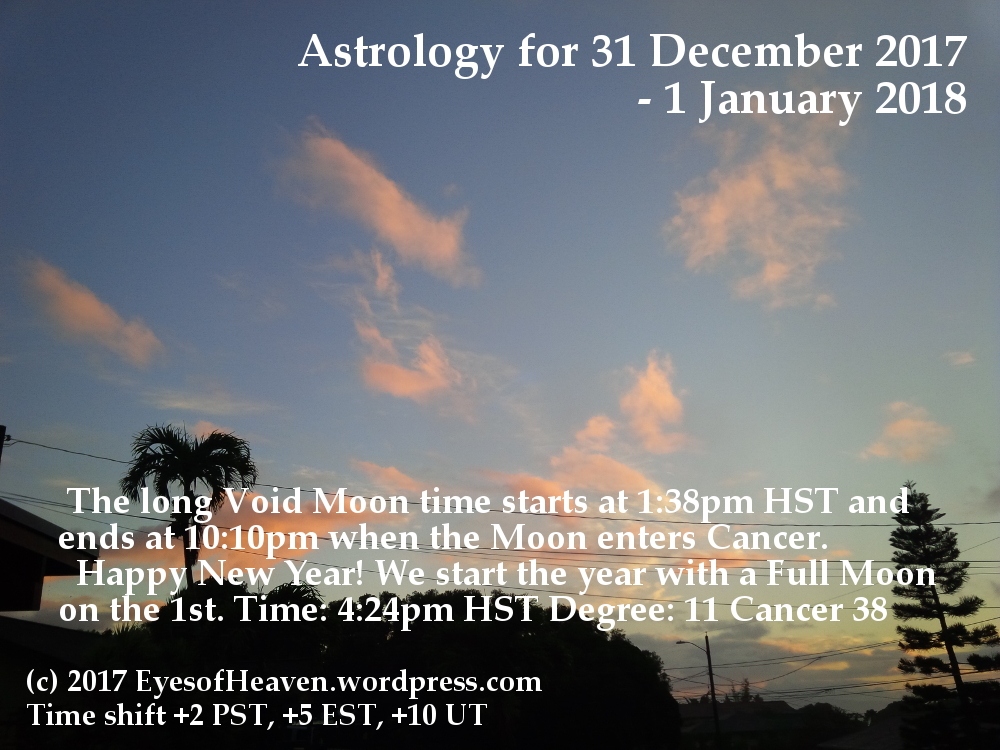 Due to the alcohol-infused New Year’s Eve celebrations and the Void Moon time, it is best to be very alert to those who have over-indulged in any altering substance behind the wheel. Plan wisely.