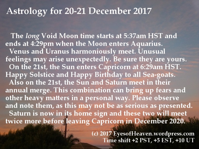 Busy days – Void Moon; Venus is jarred by Uranus; Solstice – HBD Capricorns; Sun / Saturn