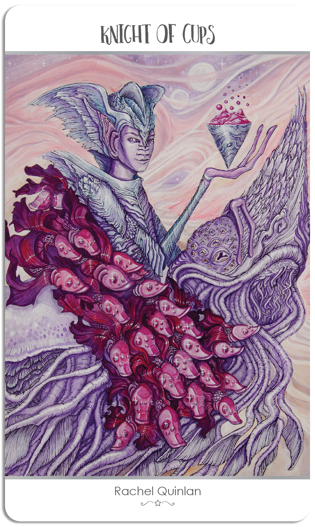 My version of the Knight of Cups for 78 Tarot Astral was based off of the Rider Waite version of the card. The winged helmet is a symbol of creativity and imagination. The white steed symbolizes purity and evokes a sense of calmness and ease, as well as power and initiative. The red fish swirling around the figure act as a cape, a symbol of creativity and consciousness. This is reflected in the liquid offered in the knight’s cup. The palette consists of warm reds, pinks, purples, and oranges to suggest a romantic mood to the piece, as well as to give the impression of an alien atmosphere. I’ve also added dual moons in the sky, alluding to the romantic nature of this card. The knight is gazing at the viewer with a wry smile. He is charming…