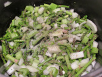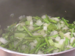 In a large stockpot, heat olive oil over medium heat, stir in asparagus, celery and onion. Sprinkle with a little salt and pepper. Continue cooking until onions turn translucent.