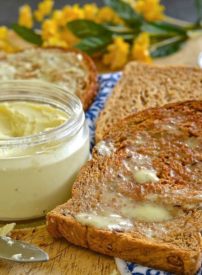 If you love butter but hate the ingredients in store bought dairy free versions then this homemade easy vegan butter recipe is the answer to your prayers. It is dreamily smooth, rich & creamy & can be whipped up in minutes. It is also palm oil & emulsifier free & can be used in any way you would use real butter!