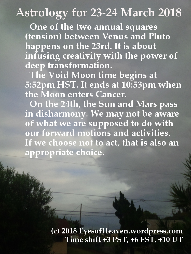 Spring Equinox/ Autumn Equinox in the Southern Hemisphere and International Astrology Day arrives March 20 @ 9:15 am PDT/ 12:15 pm EDT and 4:15 pm GMT and March 21 further east. The one of two days of balance between the Light and Dark in the year.