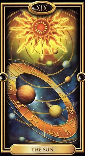 This image of the Sun card has always been one of my favorite cards ever, from the Gilded Tarot, which is one of my favorite decks ever. It conjurs up thoughts reminiscent of the 90’s TV classic, ‘Third Rock from the Sun’. There we are Mother Earth, dependent upon this fireball of a being, to provide us life on a daily basis as we orbit. The Sun is what brings us our vitality, not only is it life-giving, but it imparts feeling of positivity, when one is exposed to its rays in safe amounts. Conversely, without it, it is very easy for one to be down and depressed.