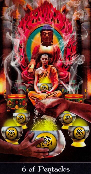 There are several cards in the Tarot which relate to various types of balance, and the 6 of Pentacles is one of them. It often serves as a reminder of the balance necessary when giving of one’s resources, such as time and money, implying that generosity can oftentimes be a fault or to one’s detriment. Occasionally, you need to pause and take a breath and remember to take time out for you. It is representative of sharing which is also a thing of balance, as well as the give and take. On the opposite side of the spectrum is greed, showing the trickle-down economics of the 1%, not leaving enough to go around in a fair fashion.