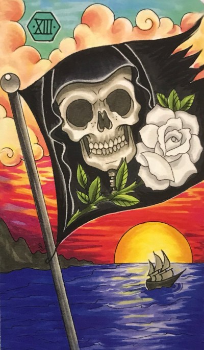 What a great image! Today’s Death card comes to us from a new deck titled Sawyer’s Path Tarot. I am loving the entire deck, but you must admit this Death card really rocks! Sailing off into a beautiful sunset does indeed make for the perfect ending.