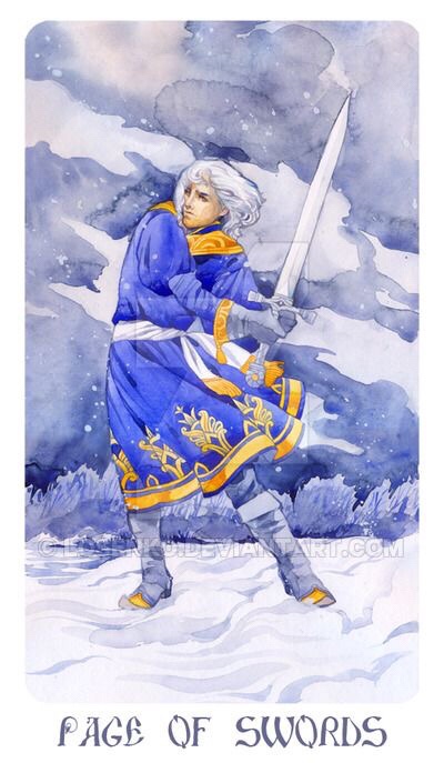 Oh, how I have come to love the Pages! The Page of Swords is a restless sort, itching to go, go, go. They are all four of them Messengers, this one dealing very much with thoughts and curiosity. Following yesterday’s Ace of Swords, you may find yourself ready to strike, flooded with new ideas. When thoughts are racing, remember it is always best to keep a pen and paper handy. You do not want to forget any!