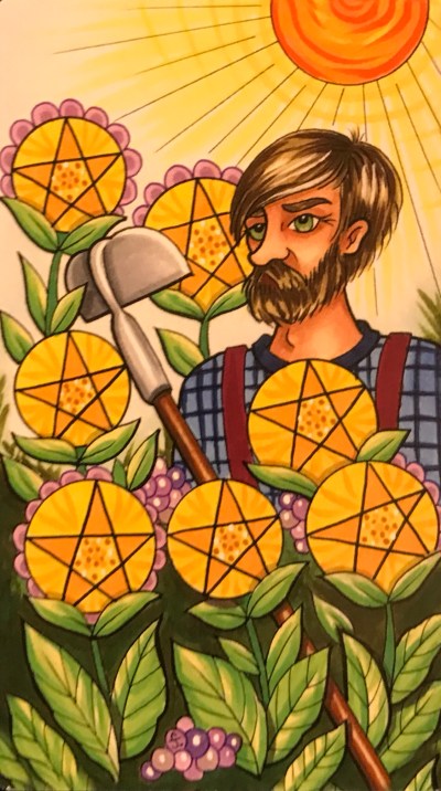 New Moon blessings, everyone! Today is the New Moon in Aquarius at 15°. The 7 of Pentacles from the Sawyer’s Path Tarot is such an appropriate card for today. At each New Moon you sow the seeds of your intentions, sending them out to the Universe, for rewards to come at a later date. This is the Garden of Life card, so do give careful consideration to the seeds you wish to plant now; remember, you reap what you sow.