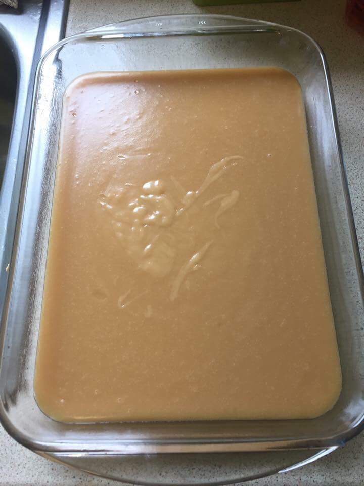 Once mix is boiling turn down but keep mix on a steady “bubble” stirring constantly (I use a whisk as I have arthritis in my hands and find that easier than using wooden spoon, but you will find your own comfortable way of doing it!) It usually takes about 15-20 minutes and the mix will turn a golden brown colour, and when it starts to feel grainy against the side of the pan it’s ready to pour into the baking tray.