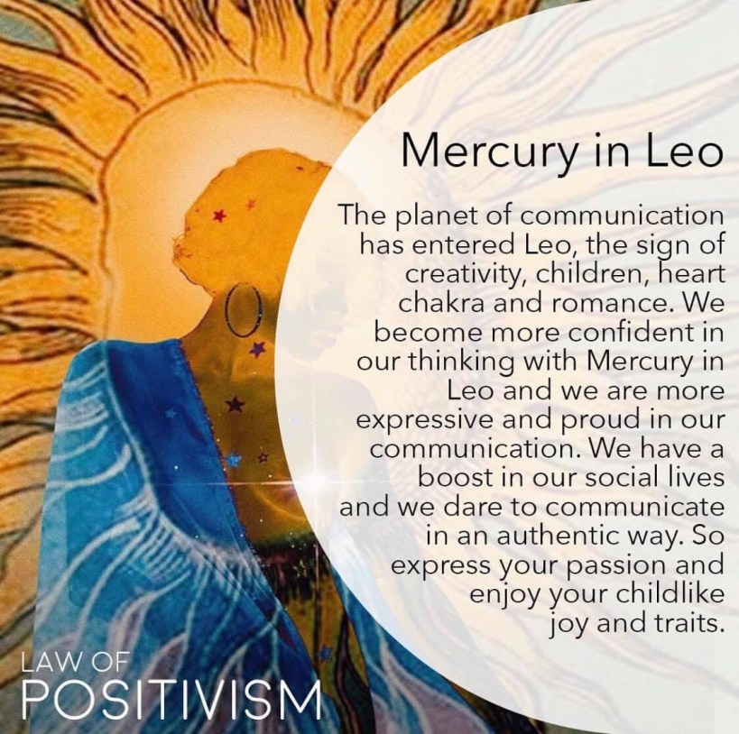 Mercury is the messenger planet and is the ruler of Gemini. Leo is our second fire sign, ruling the 5th house of joy, royalty and childlike energy. These merged together brings in wonderful and expressive energy to our communications and we dare to communicate our unique essence. This will also affect Geminis and Virgos a bit extra and is a great time for you who need to communicate before big audiences, online and in social media. Social media might get even more extravagant here and we can see big personalities being even more expressed in media and around us.