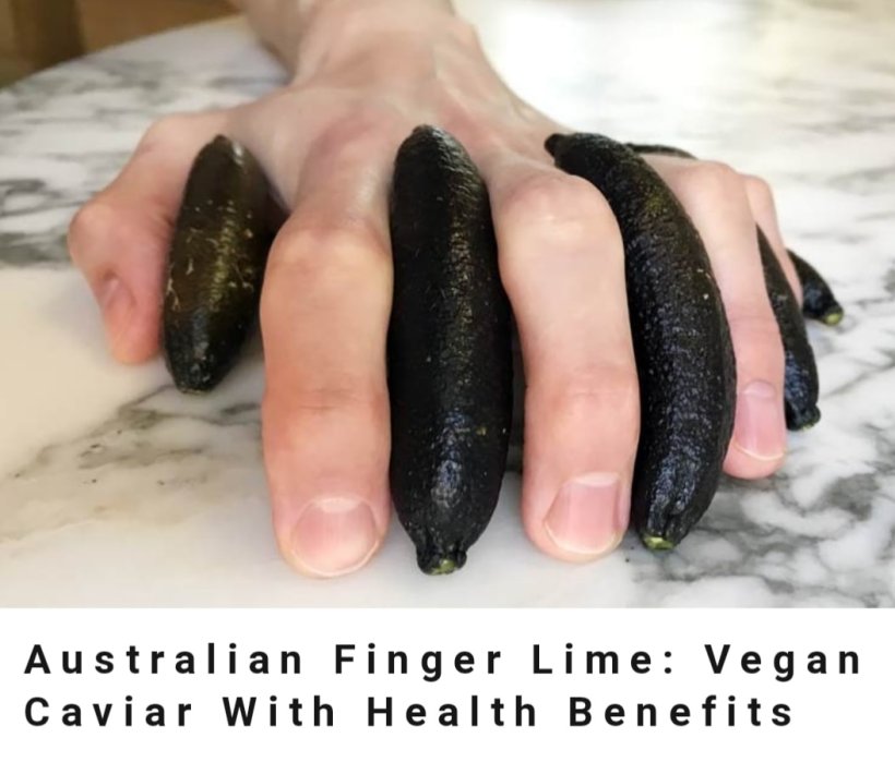 The Australian finger lime is an elongated fruit roughly the size of a human thumb, on average. Their skin is green, maroon, or any shade in-between. Hundreds of tiny juice-filled capsules are inside, which resemble caviar.