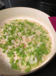 Add in rice a little bit at a time, then finish with cooked bacon.