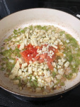 Add in corn, tomato and garlic. Cook a few minutes, or until garlic is very fragrant.