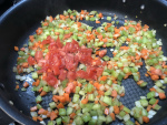 In a large pre-heated pan over medium high heat, add oil, carrot, celery, onion and bell pepper. Cook for about 4 minutes, stirring frequently, then add tomato and cook for another minute.