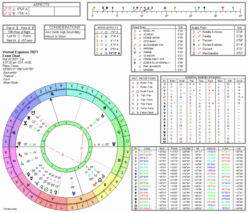 Here is the horary version of the Vernal Equinox 2021 chart. I offer this first because it points out that Mars (part of the pattern) is also (1) peregrine (an unfavorable position, a “thief” of sorts) and (2) opposite the “Part of Fatality.”