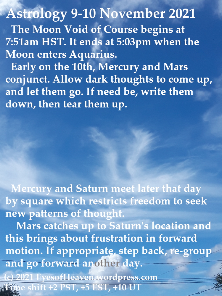 Stay grounded during the Void Moon time; Mercury and Mars have their annual conjunction; then Mercury has a bit of a hassle from Saturn; then Mars and Saturn meet, too
