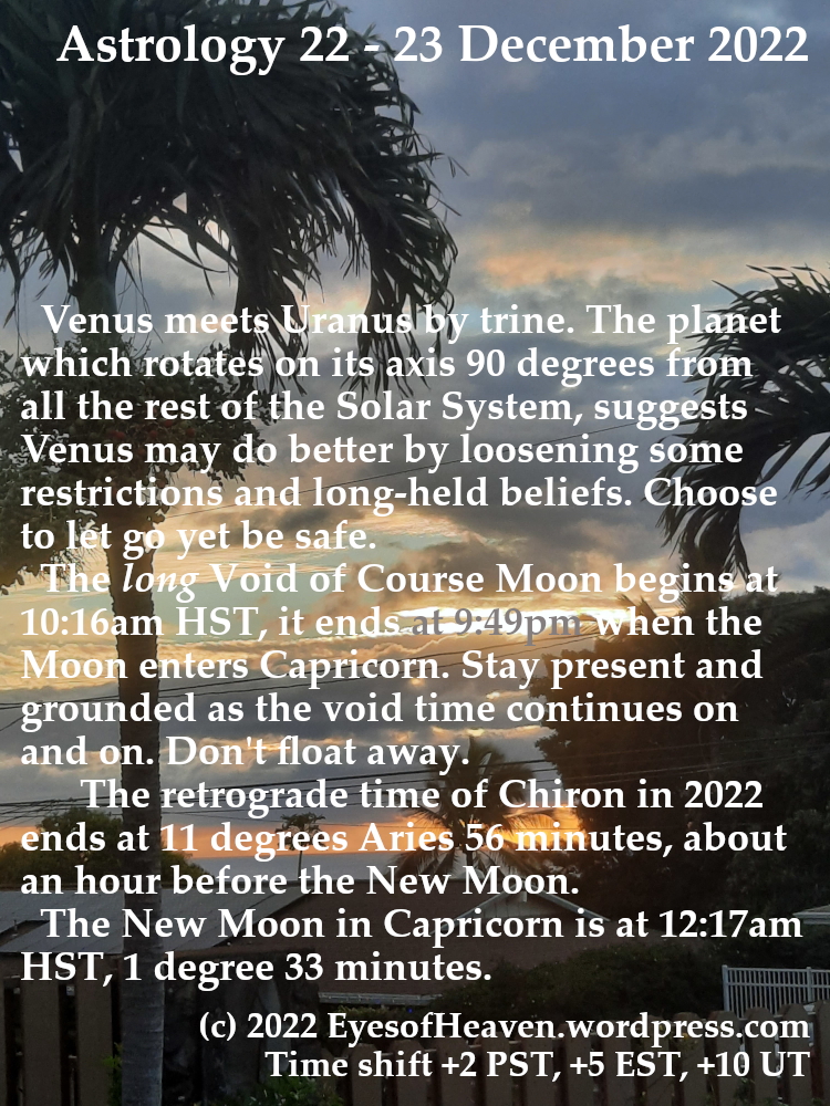 Venus and Uranus connect and this can pull sensitive Venus off her center; Long Void of Course Moon time; Chiron direct moment arrives; New Moon in Capricorn on the 23rd
