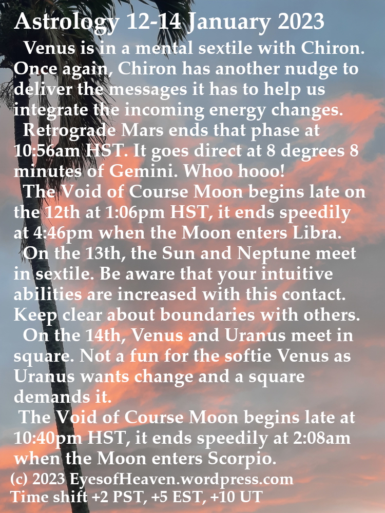 Venus connects to Chiron; Mars Retrograde ends on the 12th; Later in the day, a Void of Course Moon time begins; The Sun and Neptune connect harmoniously – use discernment with messages received; Venus is pounced on by Uranus – treat yourself kindly as change is demanded; Void Moon time again on the 14th