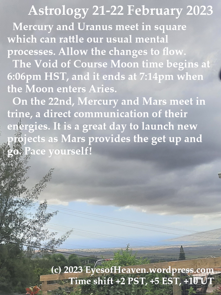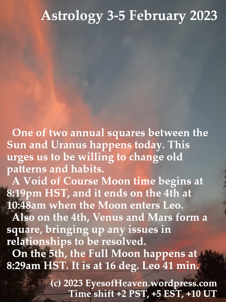 Rabbit year begins smoothly with no planets in retrograde until mid April.However, currently the Leonine full Moon and Sun in Aquarius both square Uranus in Taurus. There could be disruptions or sudden upsets because no one wants to follow a normal routine. It’s easy to chafe at restrictions placed on you by others. For many, it’s time to deliberately and carefully start to change routines and structures that are limiting.