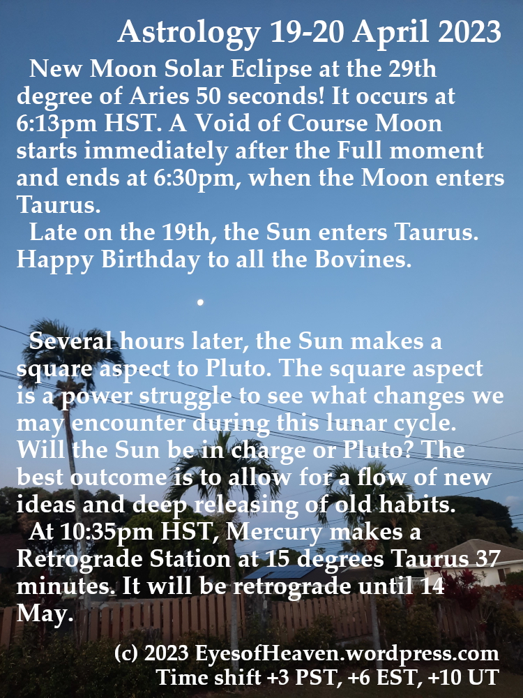 Plan ceremony for the New Moon Eclipse carefully; Void Moon follows; Happy Birthday to the Taureans; The Sun meets Pluto by square – pay attention to the transformations this urges; Mercury retrograde begins late on the 20th