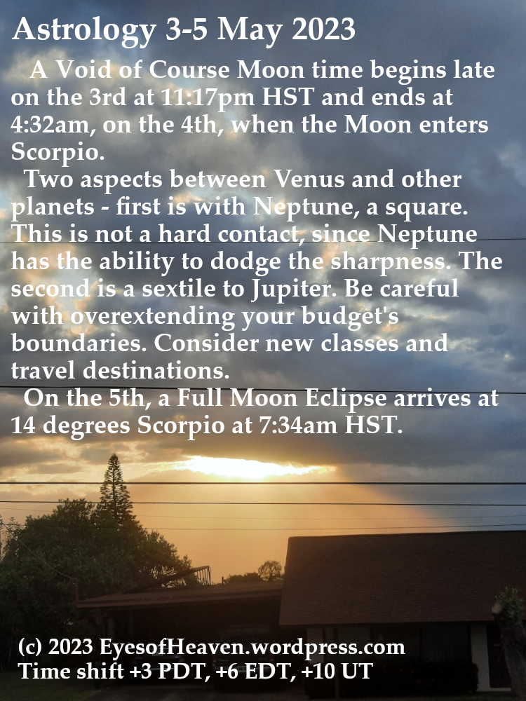 Overnight Void Moon time; Venus has two contacts, one a square, the other a sextile; Full Moon Eclipse on the 5th, at 14 degrees Scorpio