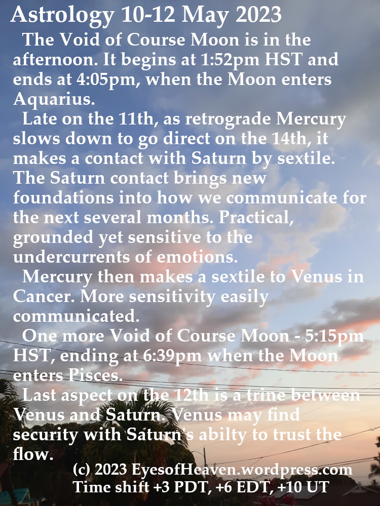 Void of Course Moon after midday; Retrograde Mercury is slowing down; Two aspects to planets with Mercury; Another Void of Course Moon; Last aspect of the day is between Venus and Saturn