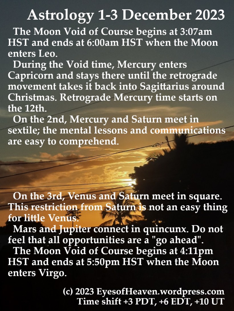 Source: Mercury enters Capricorn for a while – it meets Saturn so thoughts turn serious; Venus also connects to Saturn; Mars and Jupiter connect in an off-balance way; Void Moons are at the beginning and end of these 3 days
