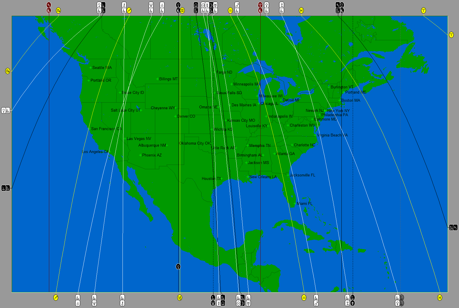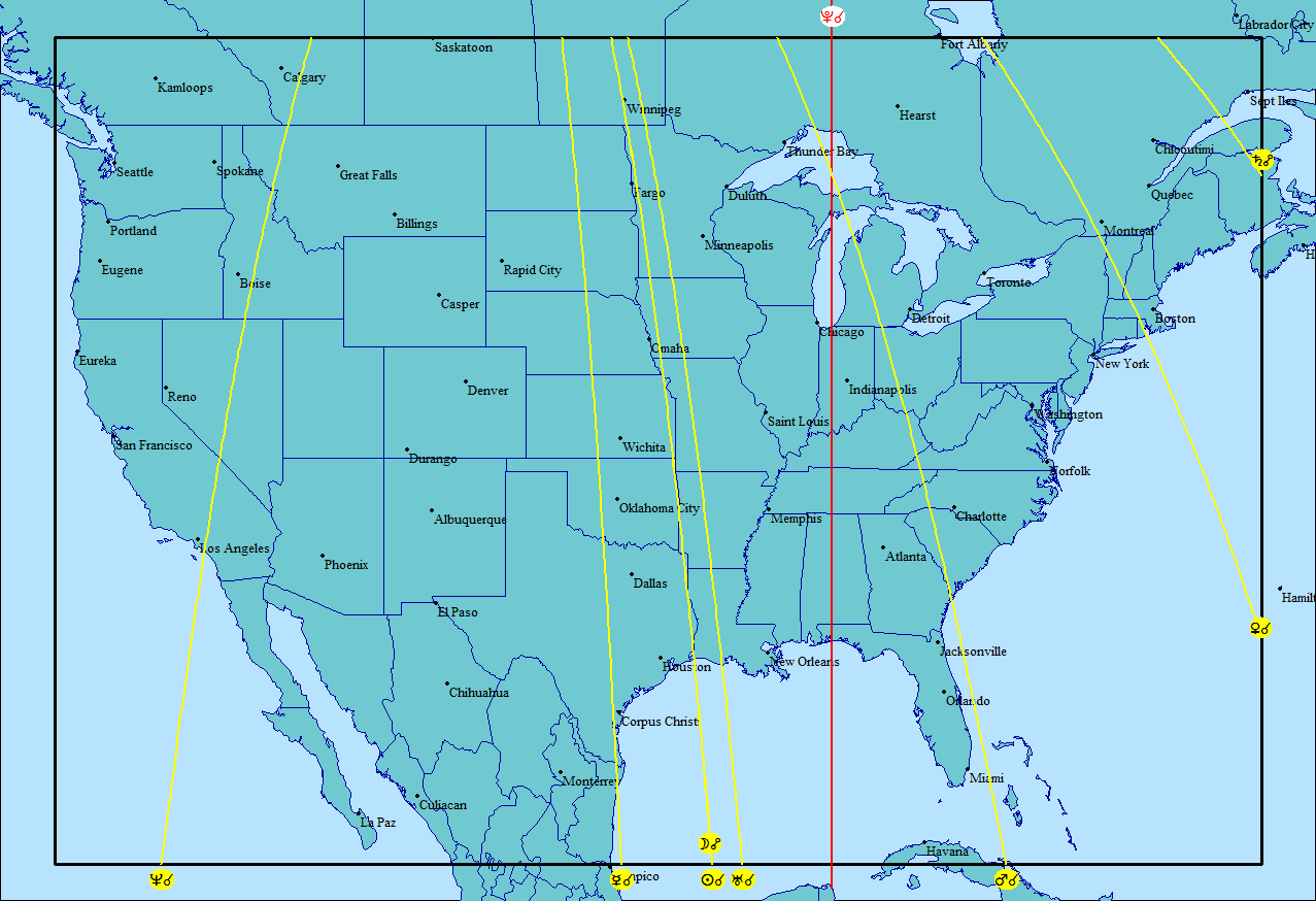 Worthy of note: (1) the Neptune line near Los Angeles (good for the film and entertainment industry; bad for people who use alcohol and drugs to excess); (2) Mercury line near Dallas (and your astrologer); (3) Venus line between New York City and Boston; (4) Pluto line through Indiana, Kentucky, and near Nashville (big changes!); and (5) a Mars line from Michigan through the boundary between South Carolina and Georgia. How do these affect your region? Take the applicable planet (Neptune, Mercury, and so forth) and look for its place in the patterns discussed in the Lunar Eclipse of April 2015 analysis.